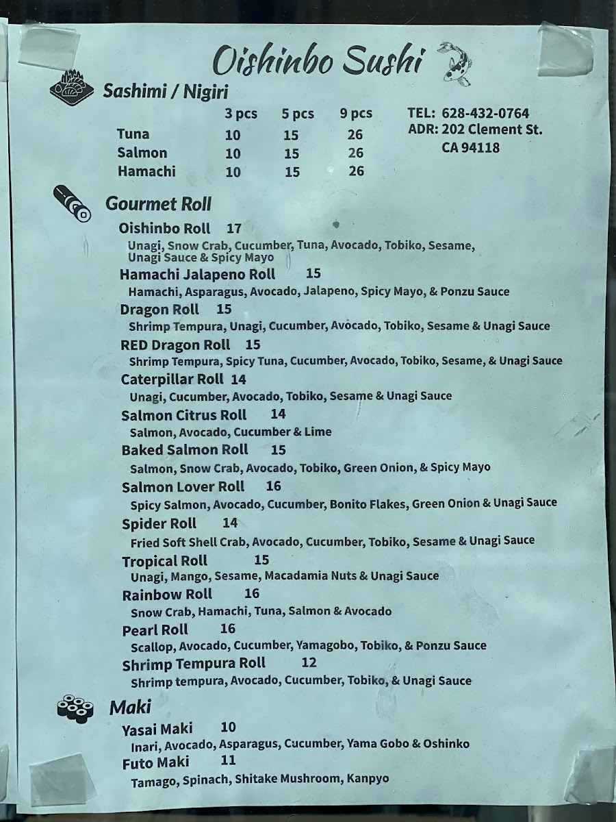 From a reviewer’s perspective, the menu at Oishinbo Sushi offers a well-rounded selection that highlights both variety and classic Japanese flavors, even though specific prices are not listed. The donburi section stands out with options like Chirashi Don, Salmon Ikura Don, Hamachi Don, Unagi Don, and Tekka Don, each delivering fresh fish over rice. The maki offerings, including Spicy Scallop Roll, Spicy Tuna Roll, Yasai Roll, Philadelphia Roll, and Negihama Maki, provide a mix of traditional and bold flavors, while the gourmet rolls such as Rainbow Roll, Red Dragon Roll, and Hamachi Jalapeño Roll elevate the experience with creative combinations. Lighter options like Wakame Seaweed Salad, Sashimi Salad, and House Green Salad balance the menu, alongside comforting sides like Miso Soup and Edamame. The nigiri and sashimi selections-featuring Salmon Nigiri 3 Pieces, Tuna Nigiri 3 Pieces, and Salmon Sashimi 9 Pieces-emphasize freshness and simplicity. Additionally, combination platters like Sashimi Moriwase 9 Pieces and Nigiri Moriwase 9 Pieces are perfect for sampling a range of items. Overall, the menu feels thoughtfully curated, offering something for both sushi purists and those seeking more inventive rolls.