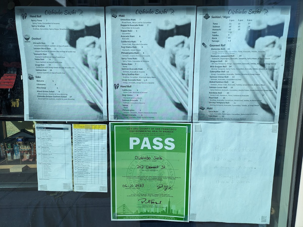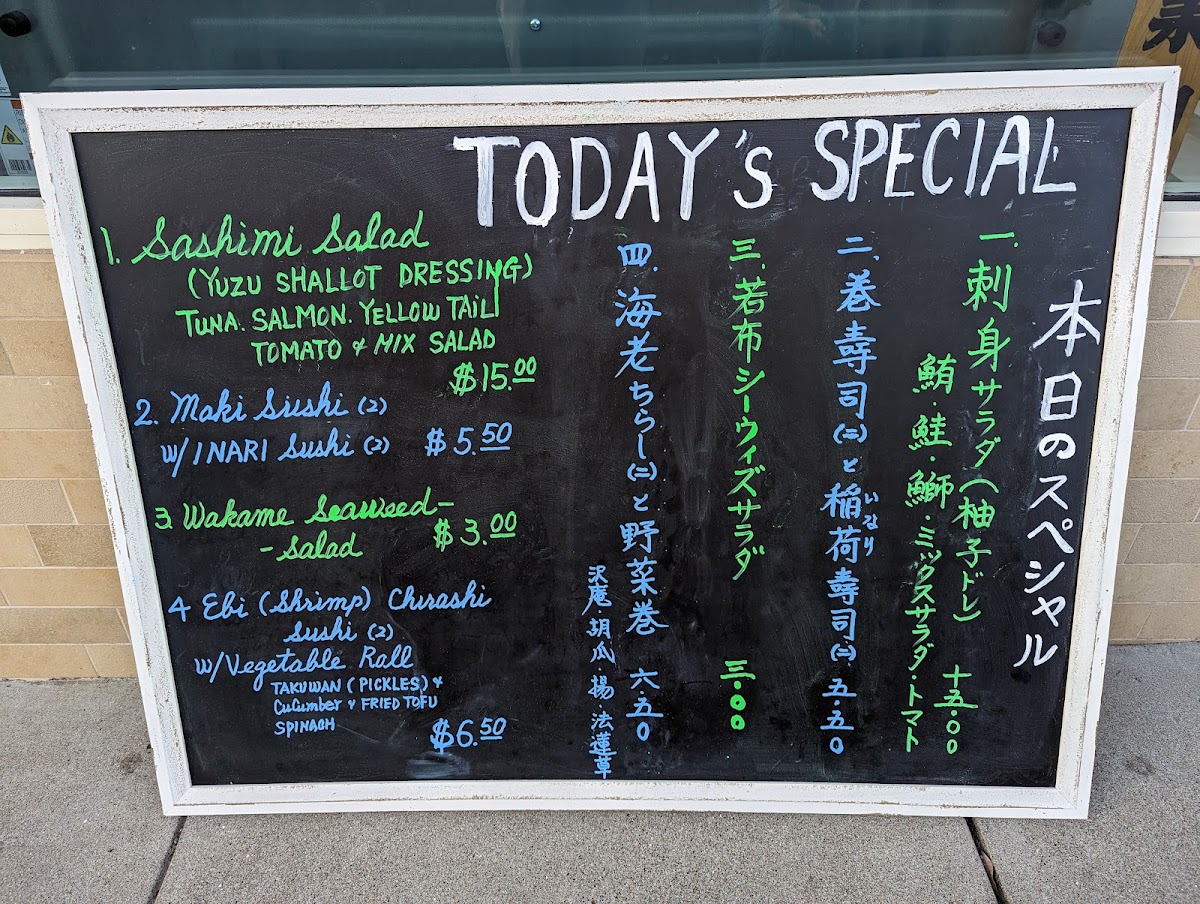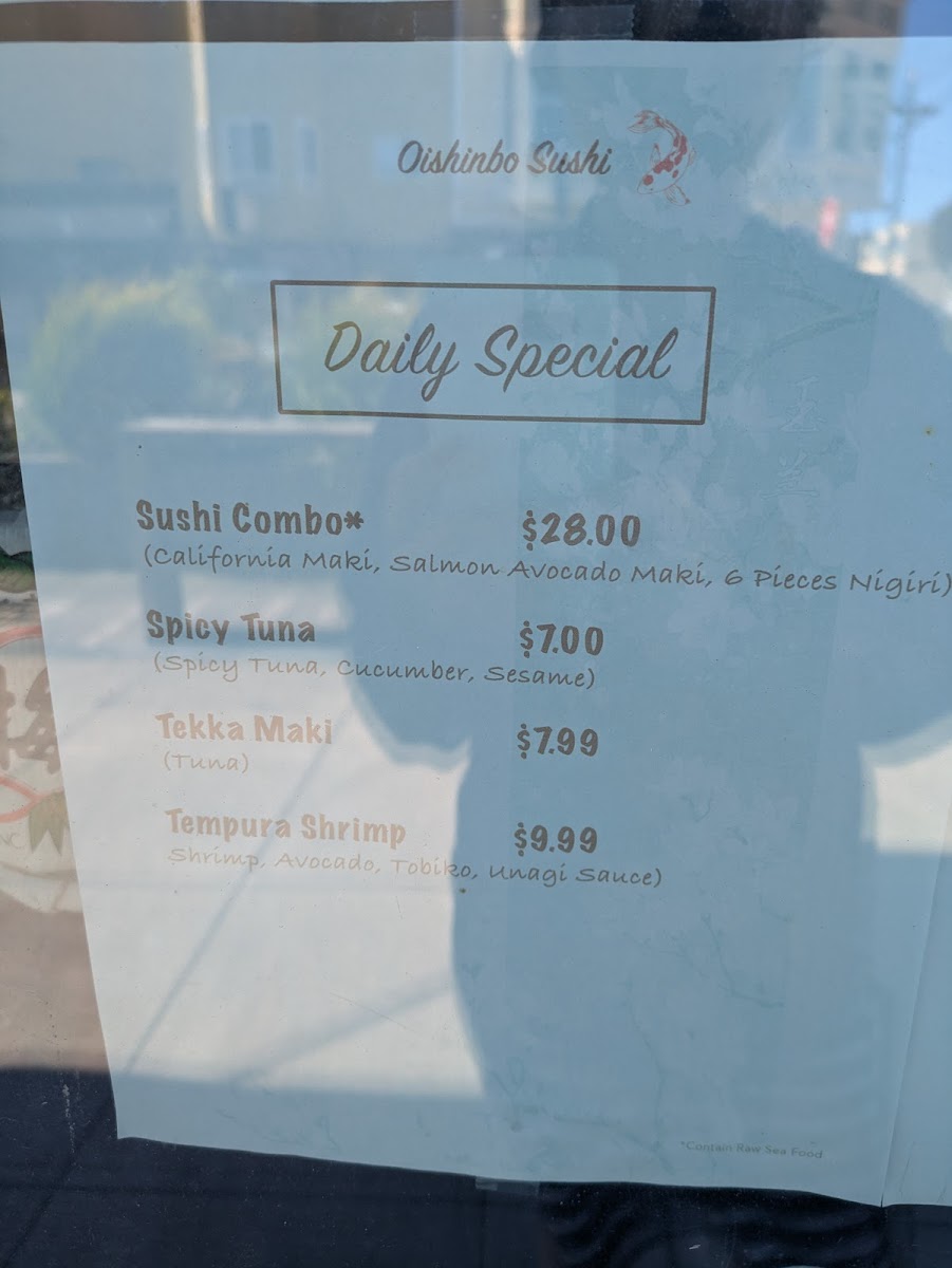 Five pieces nigiri each: salmon, tuna, hamachi plus oishinbo roll, hamachi jalapeño roll, salmon lover roll, rainbow roll.